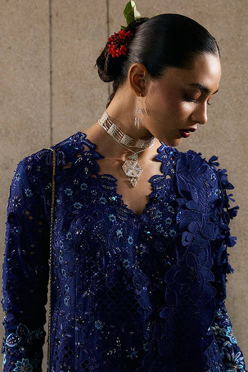 Neva, a fascination with inky elegance, is crafted from a self-textured lawn shirt and cambric lawn pants drape effortlessly, perfect for the season’s warmth. A chiffon dupatta adds a touch of ethereal charm. The detailed cutwork embroidery on the neckline elevates the look to new heights. Each stitch speaks volumes of the maker’s expertise, ensuring you turn heads with your dreamy look.
